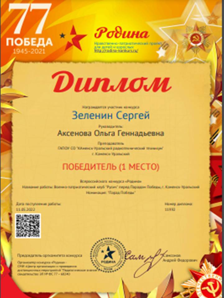 В преддверии самого главного праздника страны "Дня Победы" еще молодой, но перспективный фотограф нашего техникума Зеленин Сергей (группа Р-145) представил свою фотоработу на Всероссийском конкурсе "Родина". Работа была высоко оценена жюри конкурса и в номинации "Парад Победы" Сергея заслуженно наградили Дипломом победителя (1 место). Поздравляем и желаем новых побед и творческих успехов!