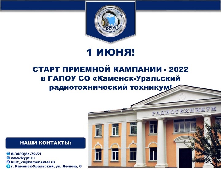 С 01.06.2022 в ГАПОУ СО " Каменск-Уральский радиотехнический техникум" стартовал прием заявлений для поступления на 2022-2023 учебный год. Подать заявление можно только после получения документа об образовании (аттестат, свидетельство).