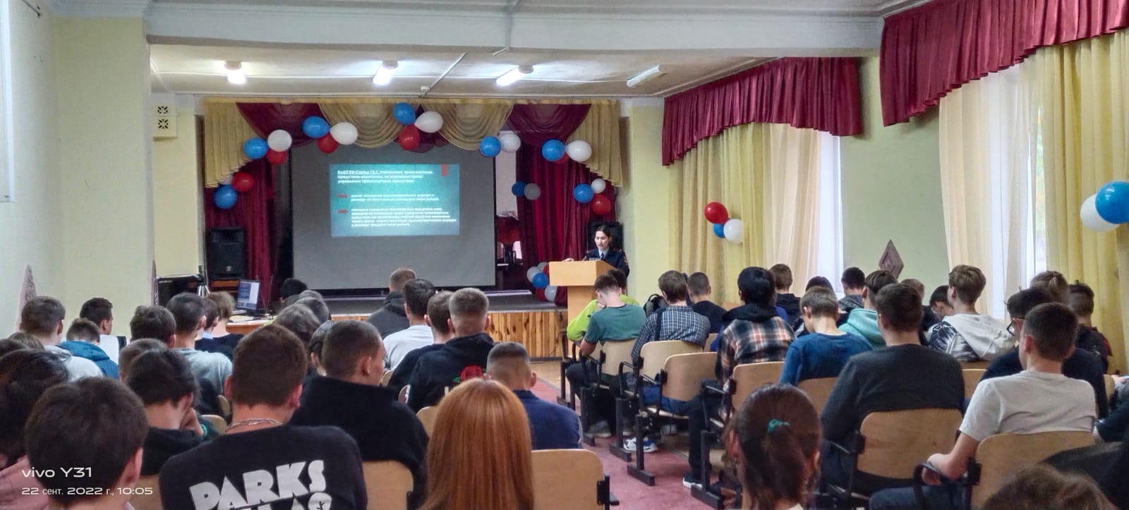22 сентября 2022 года профилактическая беседа «Аксиомы дорожной безопасности» со студентами 1-го курса провела инспектор по пропаганде БДД ОГИБДД ОМВД России по городу Каменск-Уральский . Основной целью явилось формирование правовой грамотности и предотвращение совершения административных правонарушений в области дорожного движения.
