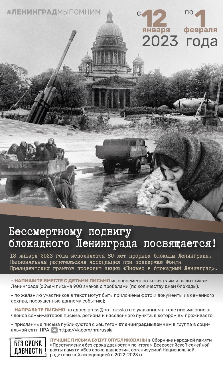 18 января 2023 года исполняется 80 лет прорыва блокады Ленинграда Национальная родительская ассоциация при поддержке Фонда Президентских грантов проводит акцию «Письмо в блокадный Ленинград»