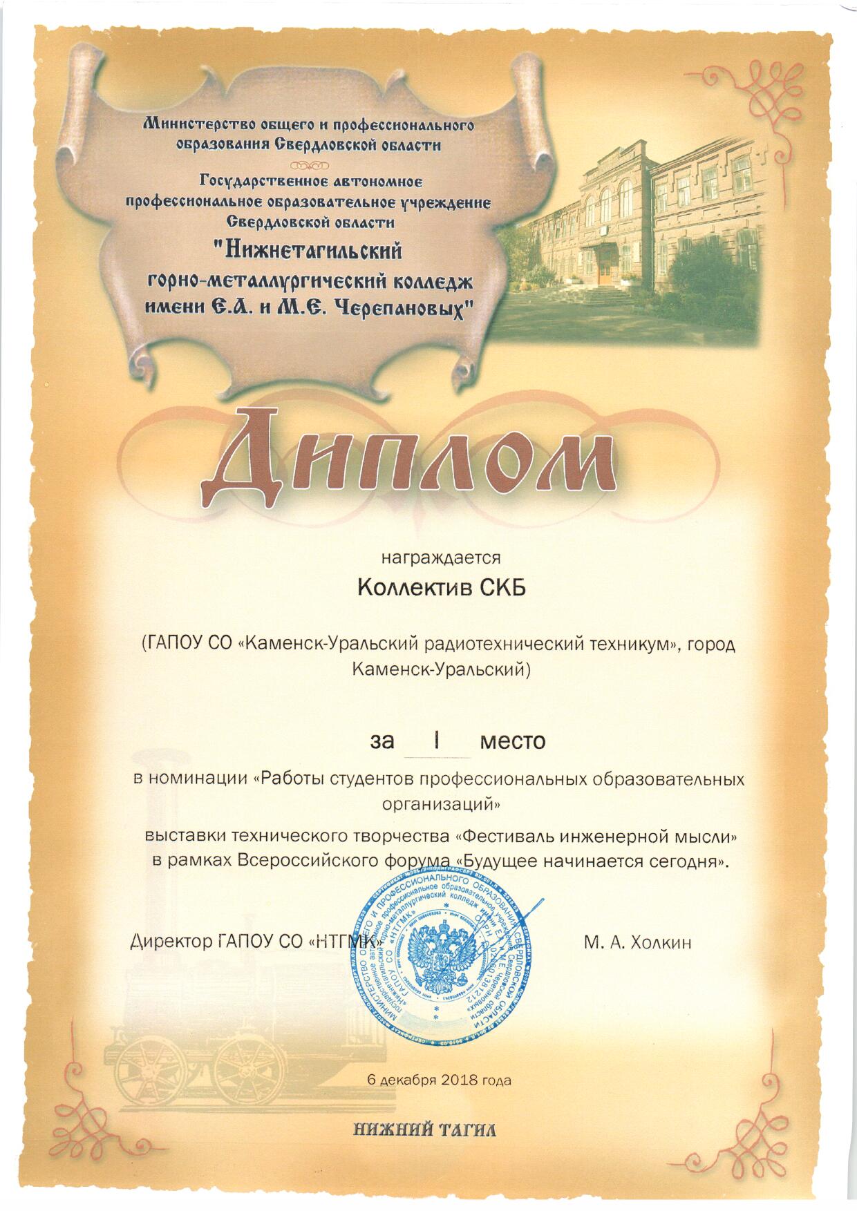 Диплом 1 место коллектив СКБ "Будущее начинается сегодня"