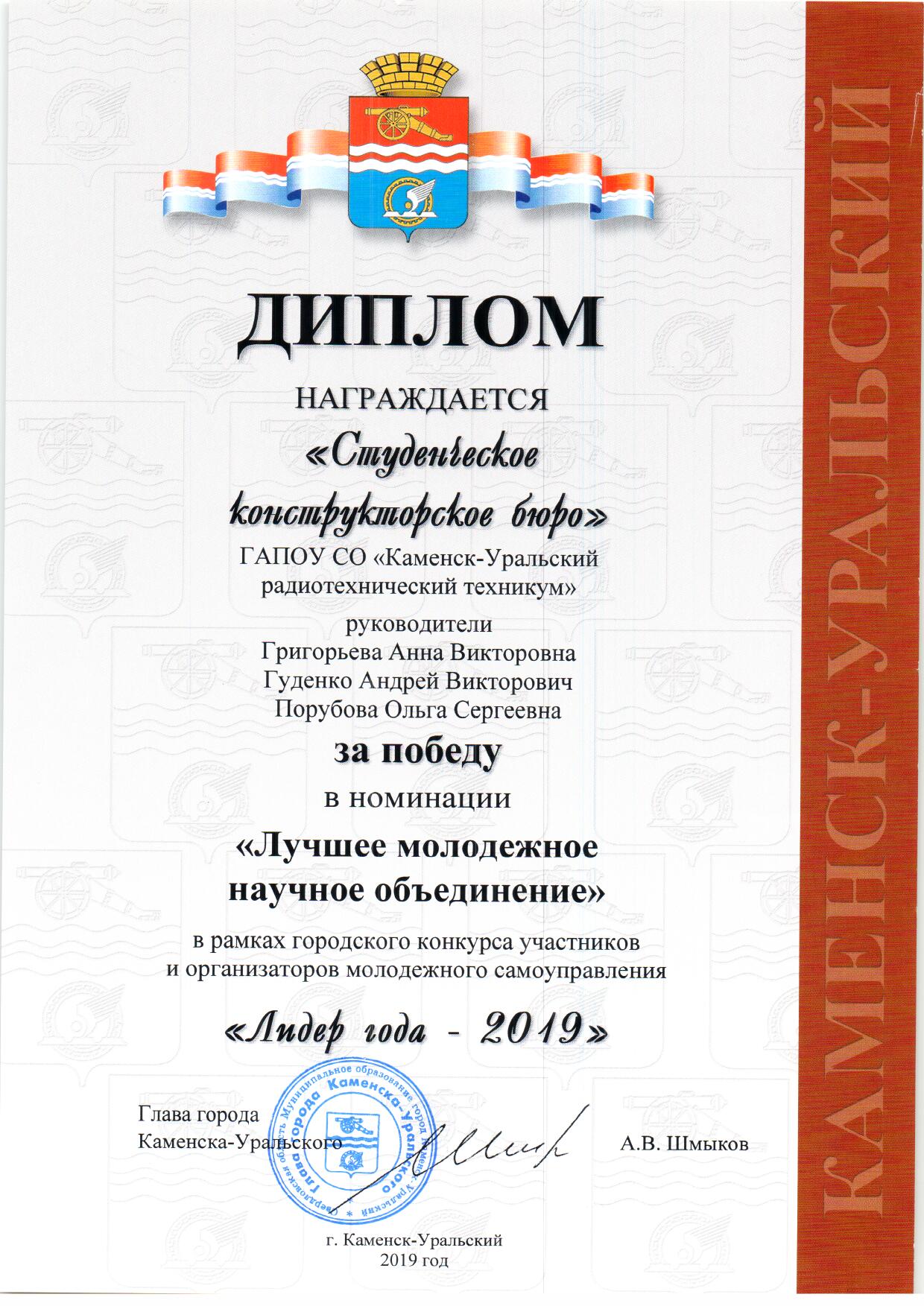 Диплом "Лучшее молодежное научное объединение" - "Лидер года 2019"
